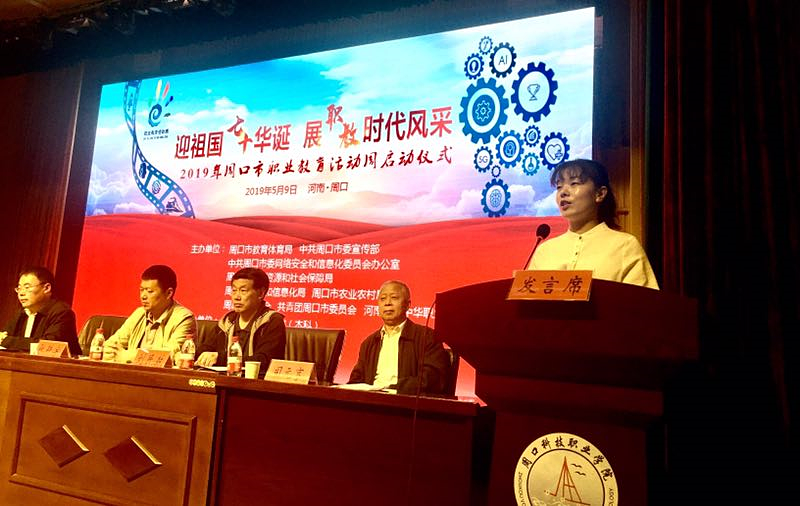 开幕式由周口市教育体育局副局长余卫国主持,市政府副秘书长朱化礼代表市政府进行了讲话,中共周口市委宣传部副部长李向宏宣布2019年周口市职教周启动。我校李森副书记作为学校代表进行了讲话、李晨阳老师作为教师代表进行了发言。