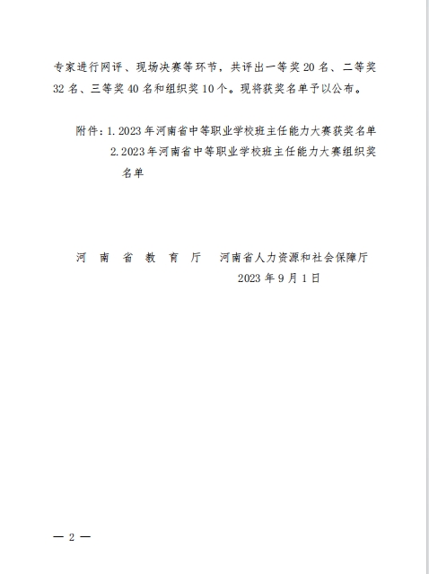 本次中等职业学校班主任能力大赛由河南省教育厅、河南省人力资源和社会保障厅主办,河南省教育科学规划与评估院承办,洛阳铁路信息工程学校协办。经各地市、各学校审核推荐,省教育厅、省人社厅组织专家对来自全省的136个代表队进行网上初评,共有54个优秀团队入围决赛。决赛阶段包括“班级建设方案实施情况介绍”、“班级活动策划”、“模拟情景处置”和“现场答辩”四个环节,全面考察了班主任在建班育人过程中的专业素养和实践能力。经过比拼,最终评出一等奖20个、二等奖32个、三等奖40个。