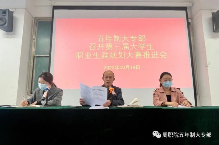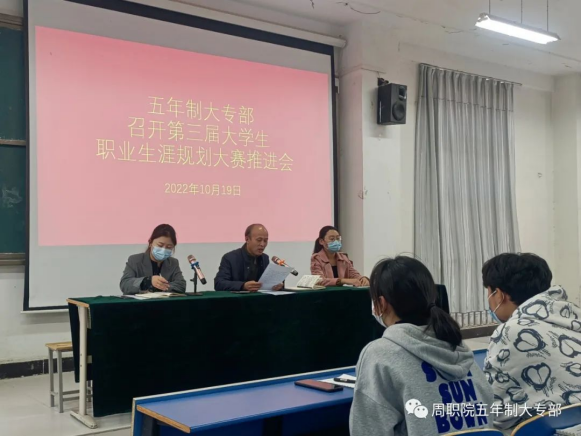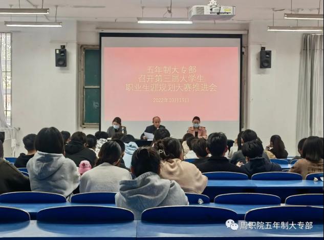 10月19日上午,伟德(bevictor)官方网站五年制大专部于北一楼多媒体教室召开第三届大学生职业生涯规划大赛推进会,对下一步赛程及相关工作安排进行动员部署。会议由王铮主任主持,五年制大专部闻杰主任、就业指导老师黄晓月及全体19、20级班长参加会议。