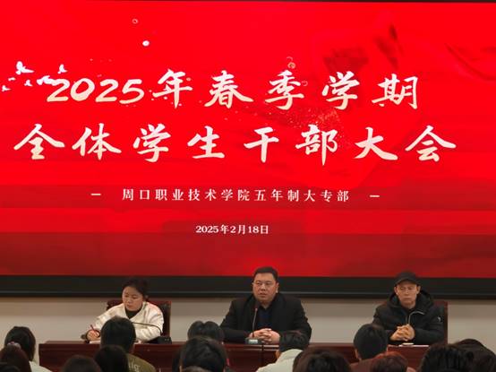 2月18日下午,伟德(bevictor)官方网站五年制大专部在中州校区图书馆4楼报告厅成功召开2025年春季学期全体学生干部大会。本次会议旨在总结上学期工作,明确新学期目标,为学生干部们注入新的动力。五年制大专部党总支书记张建刚、副主任闻杰、学管办主任王铮出席本次会议,会议由王铮主任主持。