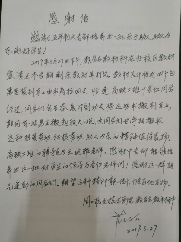 3月27日下午,五年制大专部高铁二班同学十余位同学,热心帮助教学与教材科老师搬送书籍,受到相关领导老师的表扬。